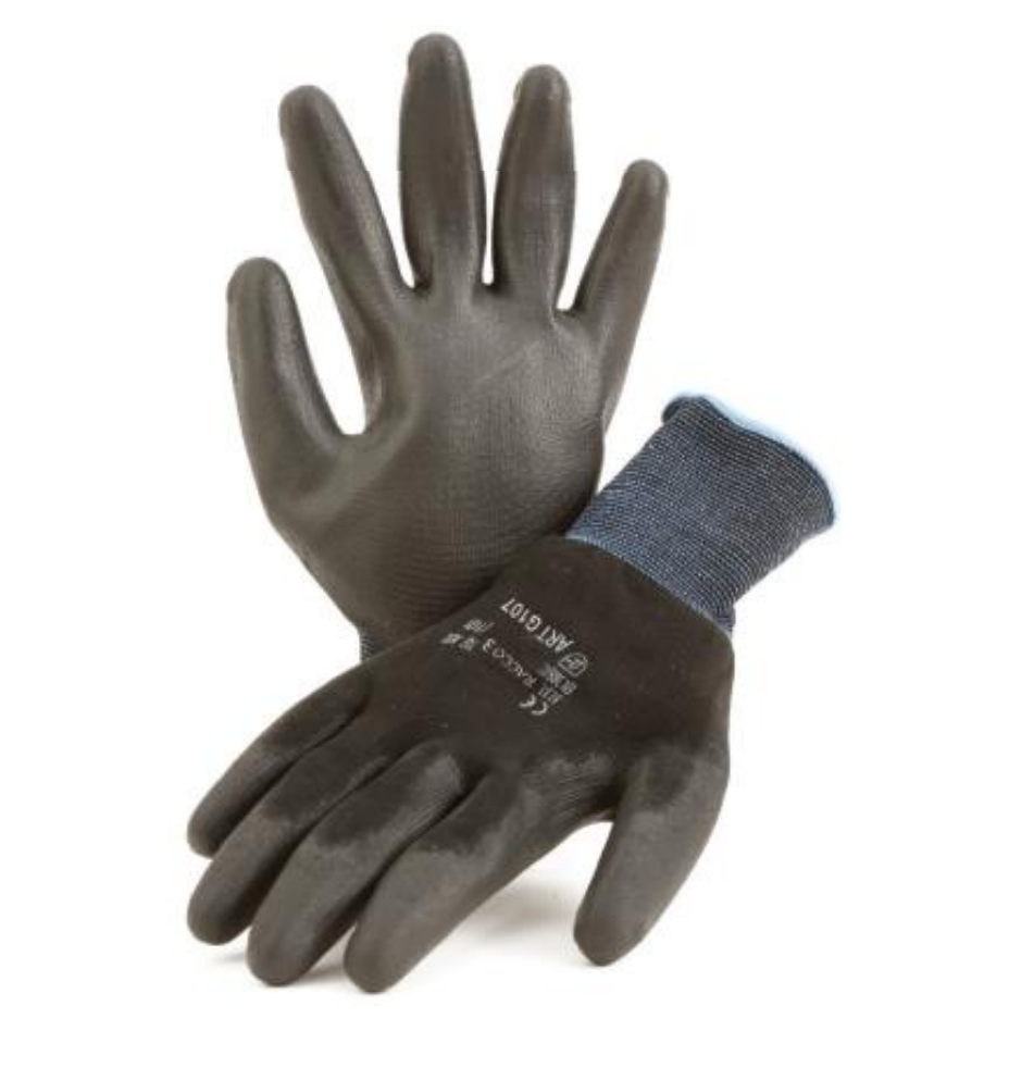 Guanto di protezione a 5 dita in maglia colore nero spalmato su lato palmo e paraunghie in materiale polimerico col.nero . Polsino elasticizzato lunghezza cm. 7 c.ca. I guanti sono adatti per le seguenti attività ( nei limiti dei livelli protettivi marcati) :